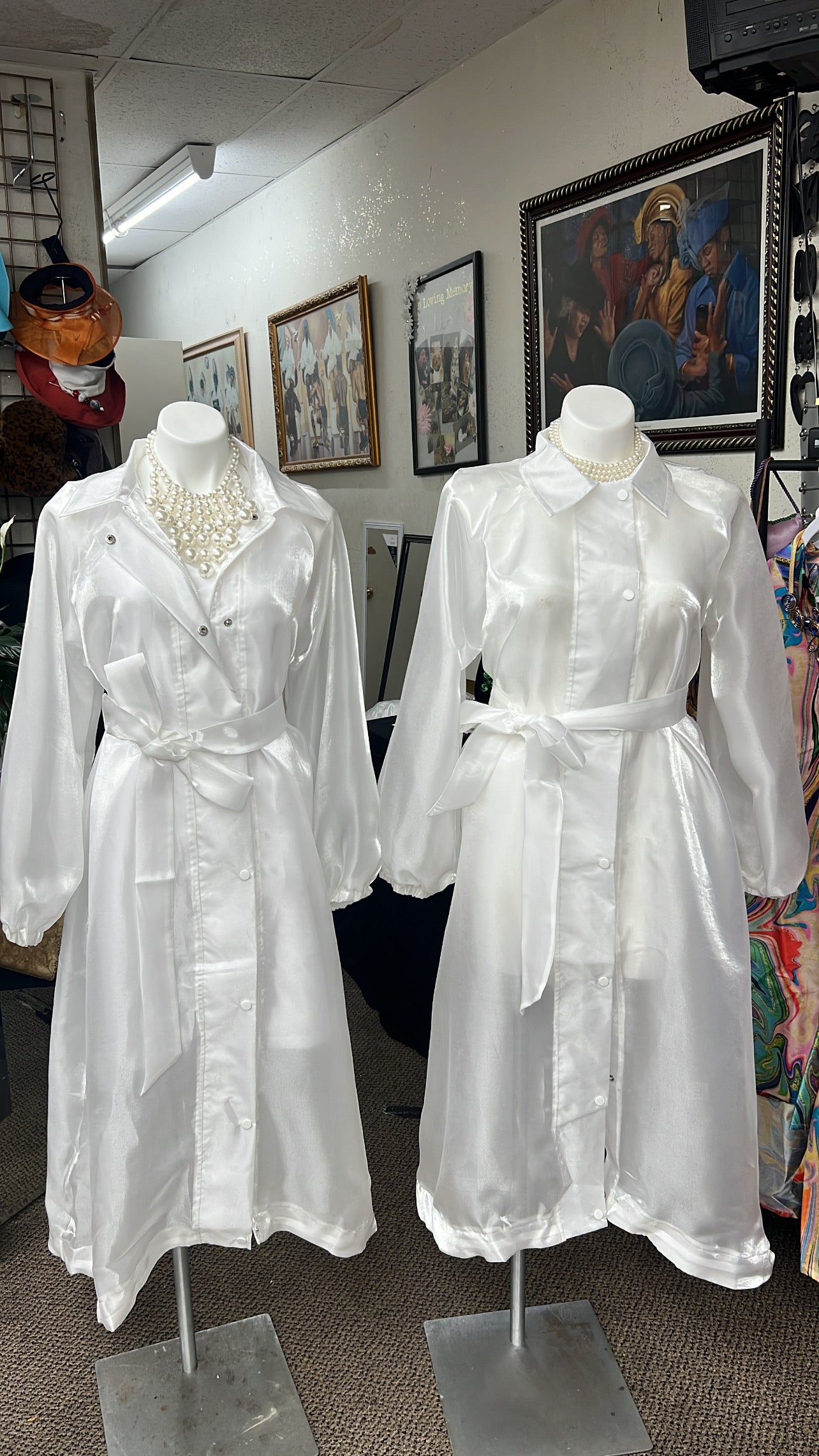 This elegant white trench-style jacket features a sleek, glossy finish with a belted waist for a flattering silhouette. Designed with a button-down front and long sheer sleeves, it blends classic sophistication with a modern, feminine touch. Perfect for formal occasions or as a stylish layering piece, it’s beautifully accented with a pearl statement necklace for added glamour.