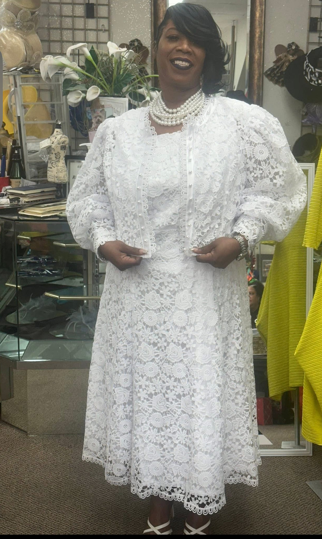 This stunning two-piece ensemble features a mid-length white lace dress with an intricate lace pattern and scalloped hemline, paired with a matching lace jacket adorned with delicate pearl accents and puffed sleeves. Perfect for formal occasions or special celebrations, this set exudes timeless grace and sophistication.